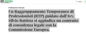 RTP guidato dall’Avv. Battista si aggiudica un contratto di consulenza legale con la Commissione UE da studiolegaleuropeo on 1 Ottobre 2025 con Nessun commento https://ntplusdiritto.ilsole24ore.com/art/un-raggruppamento-temporaneo-professionisti-rtp-guidato-dall-avv-silvio-battista-si-aggiudica-contratto-consulenza-legale-la-commissione-europea-AHAZg0uC